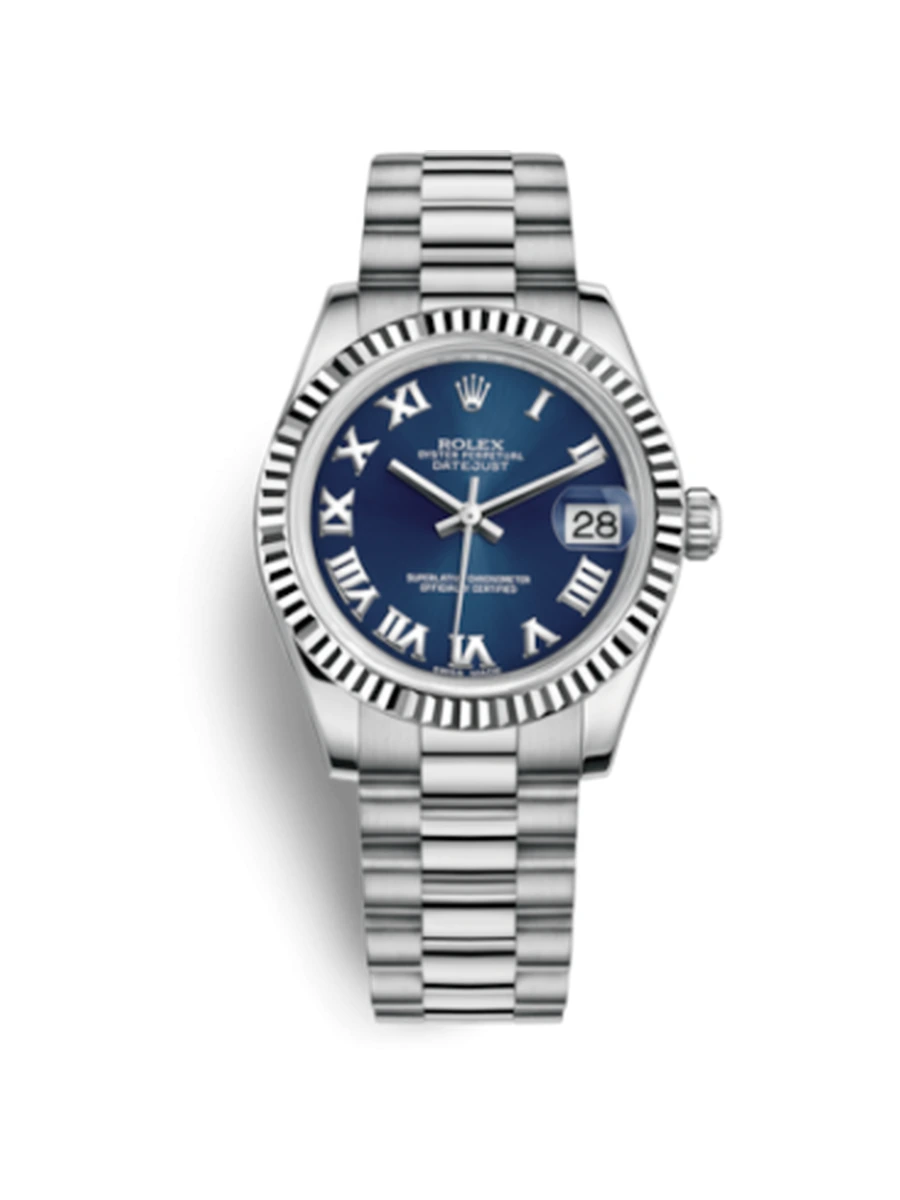 NameDatejust 31 White Gold Fluted / President / Blue Roman